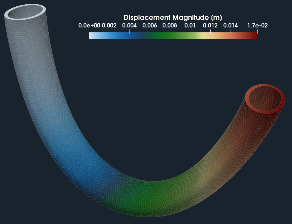 Below, there is an animation of the pipe deformation due to the fluid flow forces acting on the pipe inner surface. The deformation movement is displayed 10 times higher to enhance the details.