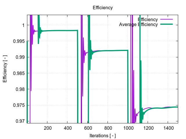 The TCAE simulation run is completely automated. The whole workflow can be run by a single click in the GUI, or the whole process can be run in the batch mode on a background. Modules used are TMESH, TCFD, and TFEA. The simulation is executed in the steady-state mode. TCFD includes a built-in post-processing module that automatically evaluates all the required quantities, such as efficiency, forces, force coefficients, flow rates, pressure, velocity, and much more. All these quantities are evaluated throughout the simulation run, and all the important data is summarized in an HTML report, which can be updated anytime during the simulation, for every run. All the simulation data are also saved in tabulated .csv files for further evaluation. TCFD is capable of writing the results down at any time during the simulation. The convergence of basic quantities and integral quantities is monitored still during the simulation run. The geometry was created onetime using TCAD in the preprocessing phase. First, the TMESH is executed to create the volume meshes for CFD & FEA. Then the CFD simulation is executed and evaluated. After that, in the FSI step, the pressure field is integrated to create the force field which is prescribed as a load for the FEA simulation. Finally, the FEA simulation is executed and evaluated.