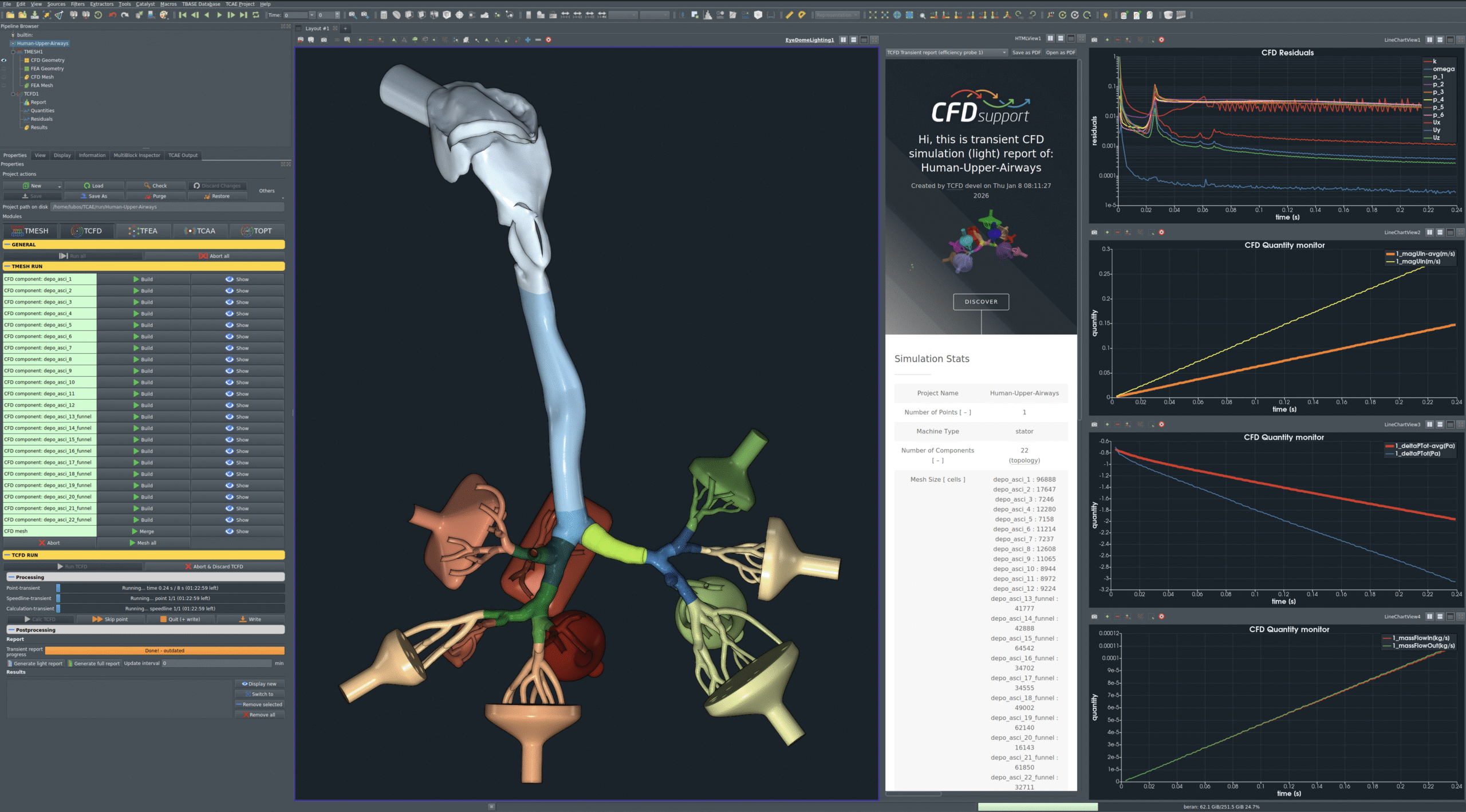 This modular structure enables the user to build, adapt, and execute complex simulation workflows without leaving the unified interface. Moreover, the current setup naturally lends itself to extending the simulation with additional TCAE modules: TFEA for structural analysis, TCAA for aeroacoustics, and TOPT for design optimization. These modules can be seamlessly combined to explore fluid–structure interaction, acoustic, or automatization, depending on the specific research objectives.