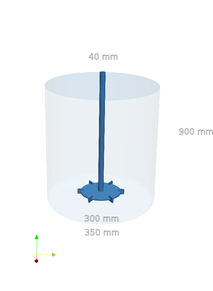 The Rushton impeller is centrally mounted on a vertical shaft. The impeller consists of a flat horizontal disk fitted with six flat, vertically oriented blades, evenly spaced around the disk circumference. The impeller diameter is 350 mm and each blade has a height of 40 mm, and a width of 50 mm.