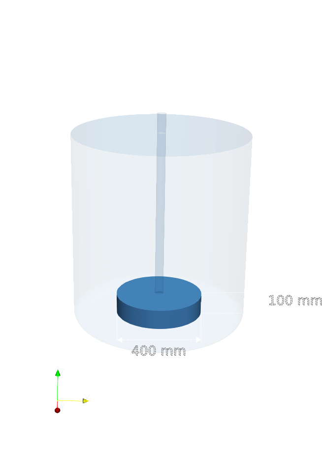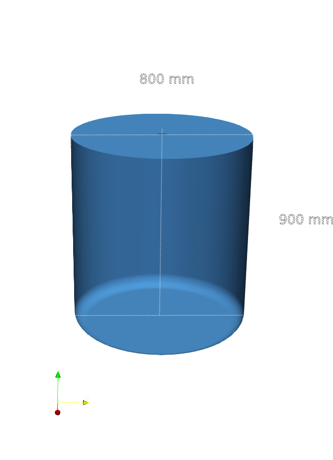 The mixing vessel has a inner diameter 800 mm and a total height 900 mm. While the main body of the vessel is cylindrical, the bottom is not flat. Instead, it features a smoothly rounded bottom section. Furthermore, no baffles are included in the current configuration.