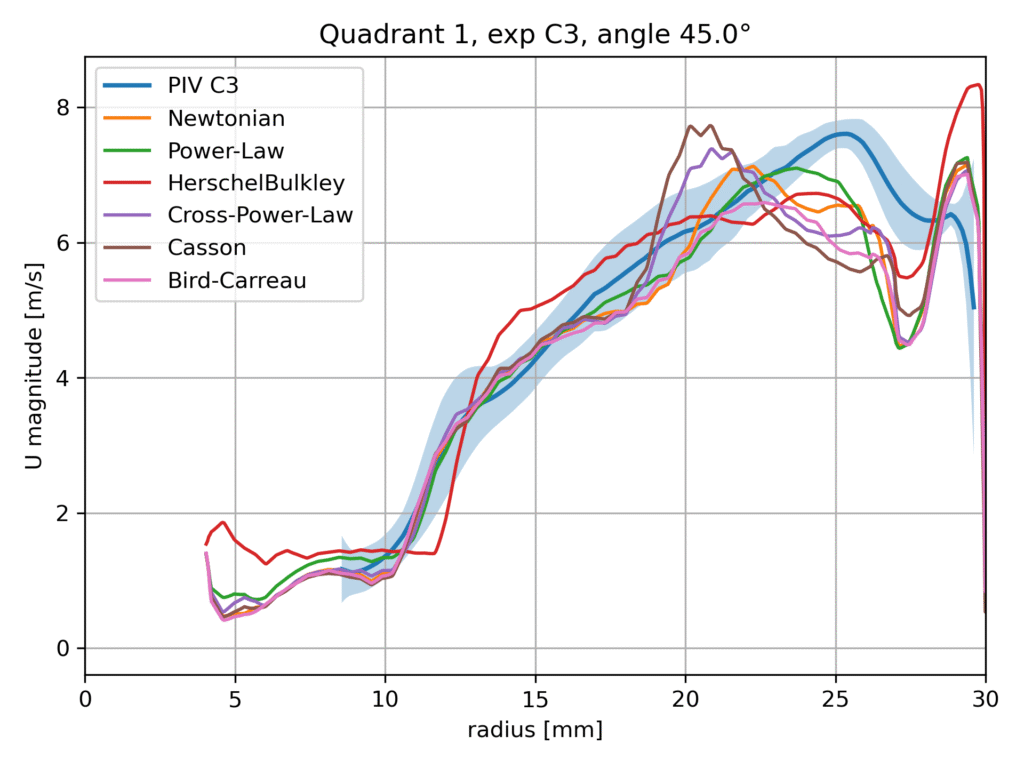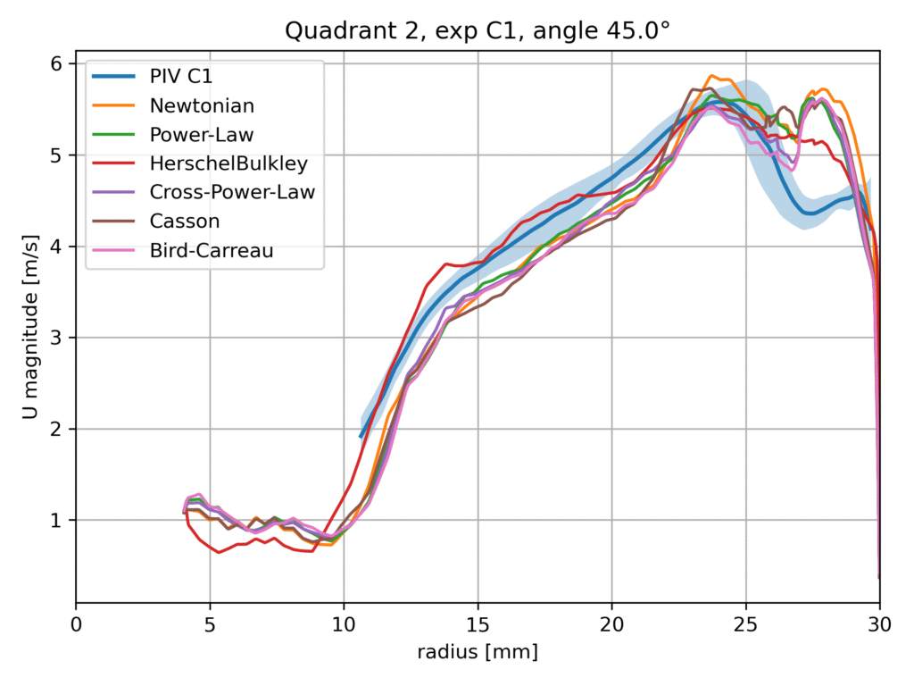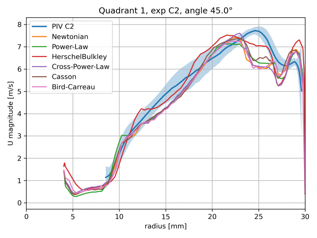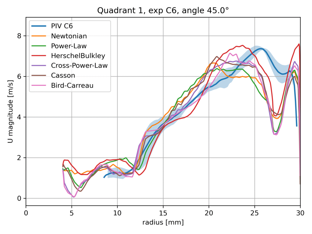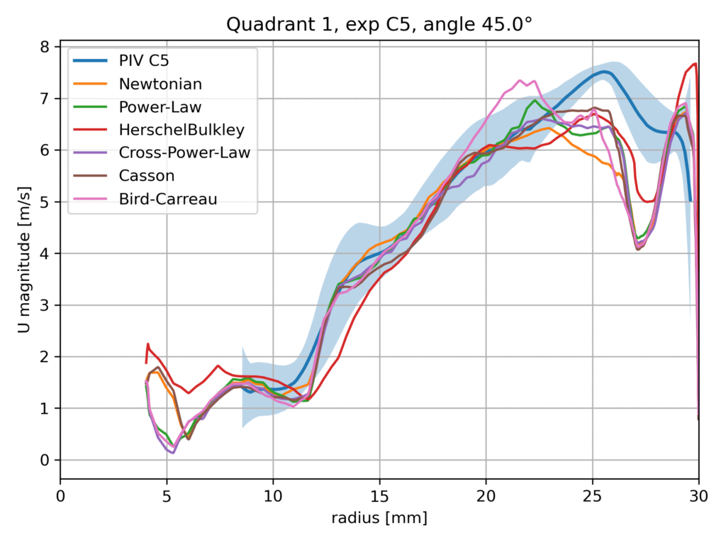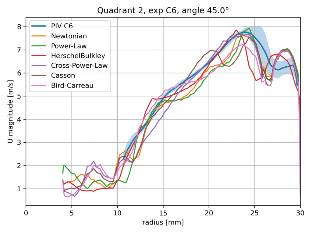 Within this benchmark configuration, different rheological models are evaluated and compared against the available experimental data, including Particle Image Velocimetry (PIV) measurements. The aim of this comparison is not to identify a universally superior model, but rather to assess the sensitivity of the predicted flow field to the chosen viscosity formulation and to examine the consistency of the numerical results with experimental observations.