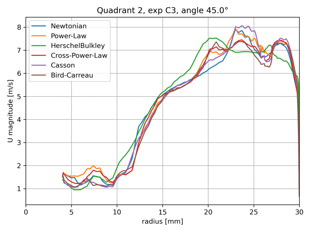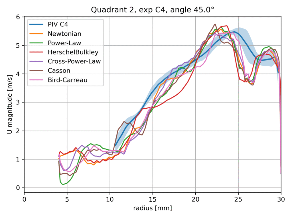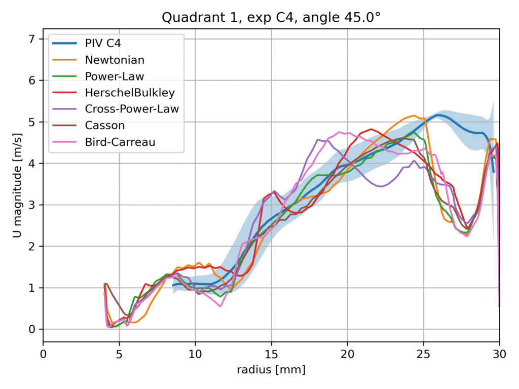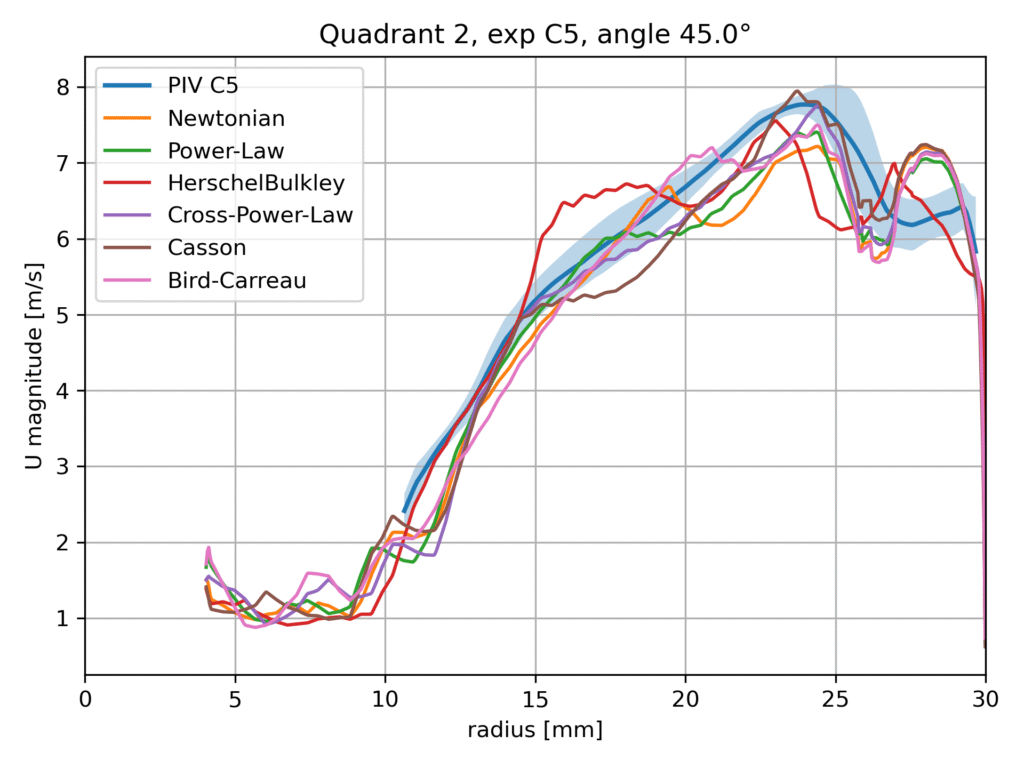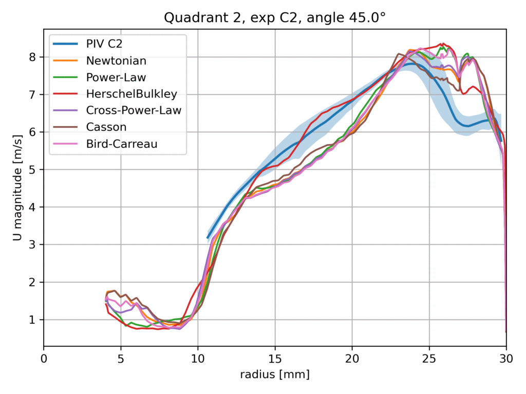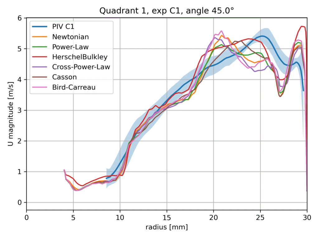 Within this benchmark configuration, different rheological models are evaluated and compared against the available experimental data, including Particle Image Velocimetry (PIV) measurements. The aim of this comparison is not to identify a universally superior model, but rather to assess the sensitivity of the predicted flow field to the chosen viscosity formulation and to examine the consistency of the numerical results with experimental observations.
